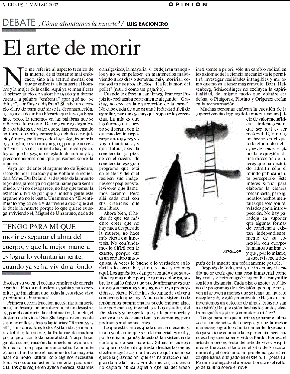 Treball de recerca realitzat per un alumne d’ensenyament secundari i guardonat amb un Premi CIRIT per fomentar l'esperit científic del Jovent l’any 2006. El debat filosòfic sobre el lliure albir dels éssers humans per a decidir els seus actes, s’ha centrat aquí en el problema de la llibertat de triar la pròpia mort com a màxima manifestació de lliberta. Aquesta reflexió té també com a objectiu retre homenatge a la figura i obra del filòsof Jean Paul Sartre en el centenari del seu naixement. Es defineix i situa el concepte de llibertat humana en el marc de la discussió. En segon lloc, s’exposa de quina forma l'acte de suïcidi esdevé la manifestació suprema del lliure albir de l'individu. Un cop plantejats els eixos mestres de la discussió, es porta l'atenció cap a la reflexió de Sartre sobre la llibertat, acompanyada dels precedents filosòfics i existencials que van configurar la doctrina del filòsof francès. Es conclou que la llibertat com a acte de tria conscient de les persones es troba radicalment arrelada a la condició humana que, portada per l'angoixa i la desesperança de la seva capacitat de tria, aliena la seva llibertat a instàncies d'àmbit social, tot i que la consciència de llibertat depassa aquest marc social i aboca a la reflexió final de l'individu, que pot triar entre ésser i no ésser, opció aquesta que passa per la voluntat de triar la pròpia mort.